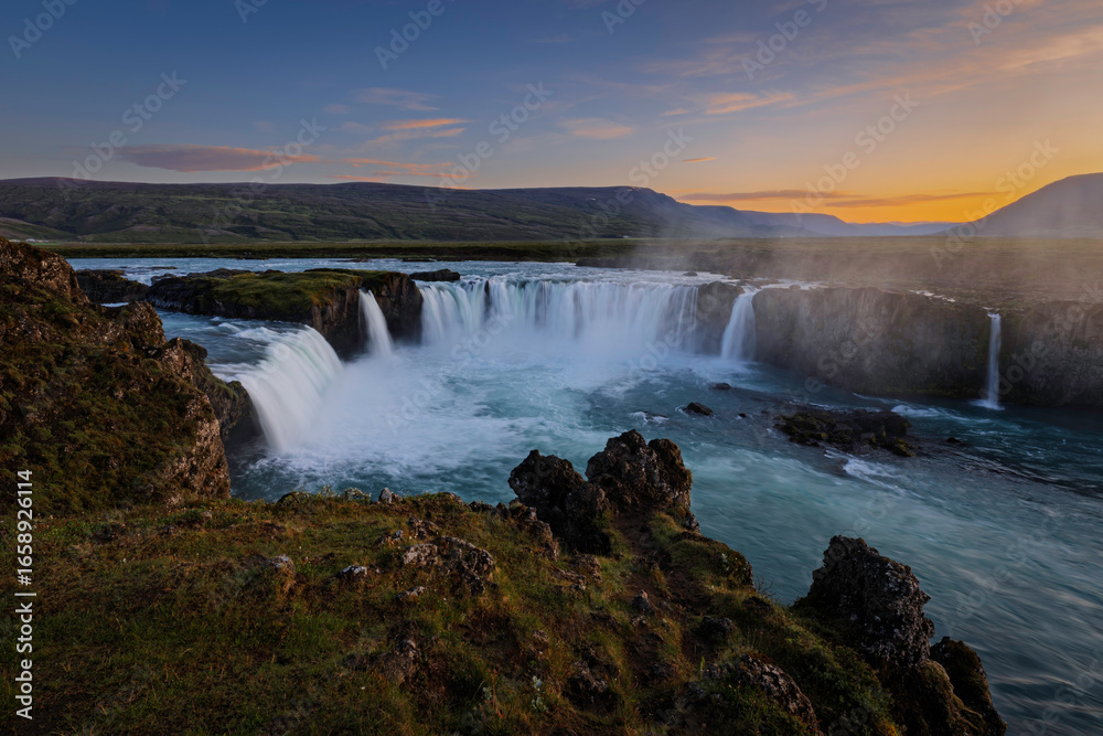Godafoss waterfall in north Iceland in the summer with the light of the midnight sun.
