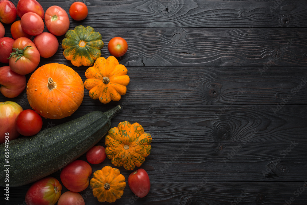 Composition of pumpkin squash and tomato on a wooden background