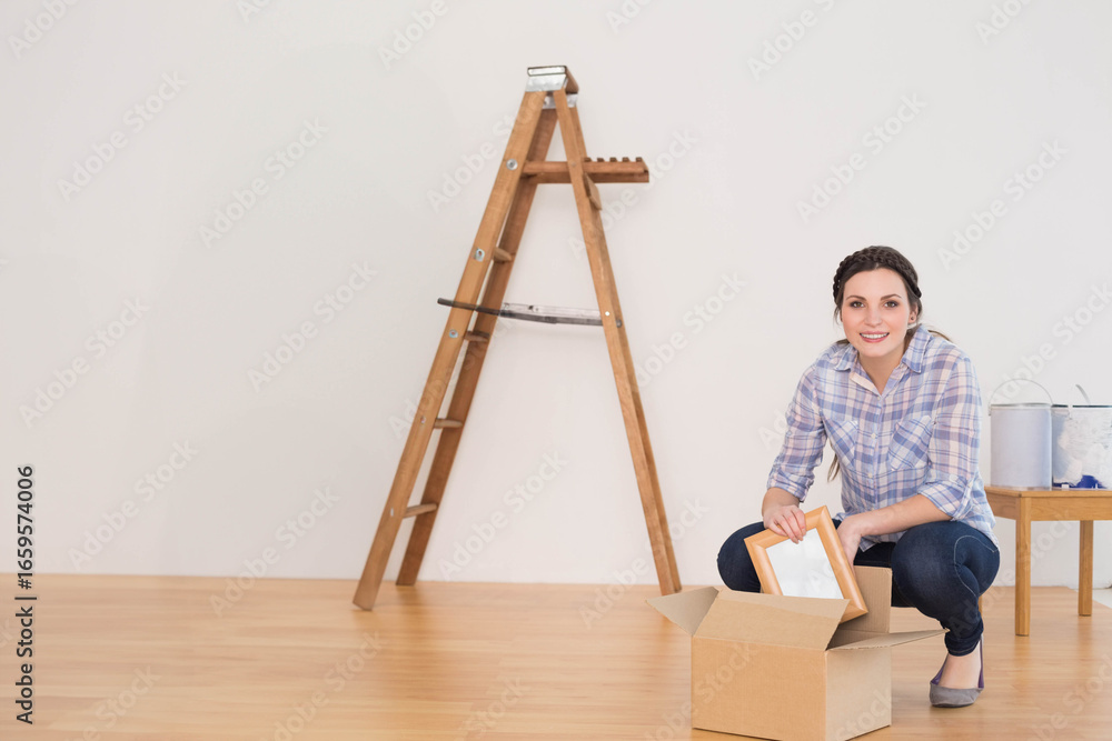 Woman kneeling in room unpacking frame from cardboard box beside ladder and paint cans, copy space