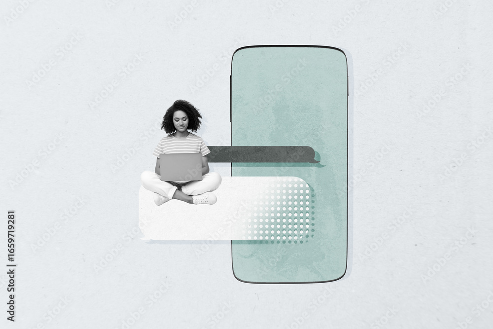 Collage of young woman using smartphone for social media chat big touchscreen blogging with message bubble graphics