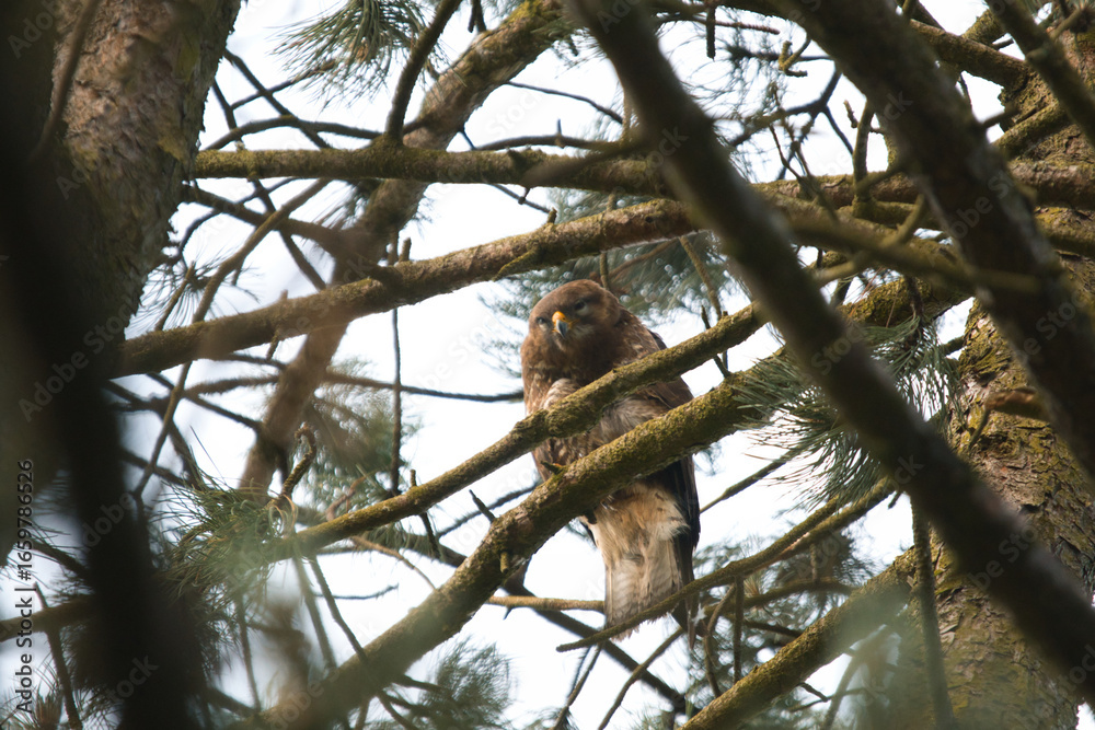buzzard staring frombetween the branches
