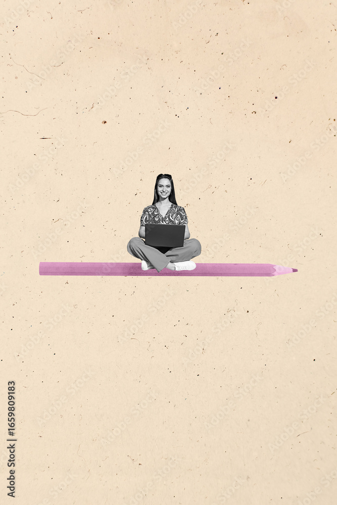 Collage of person sitting thoughtfully on large pencil symbolizing creativity online learning digital communication