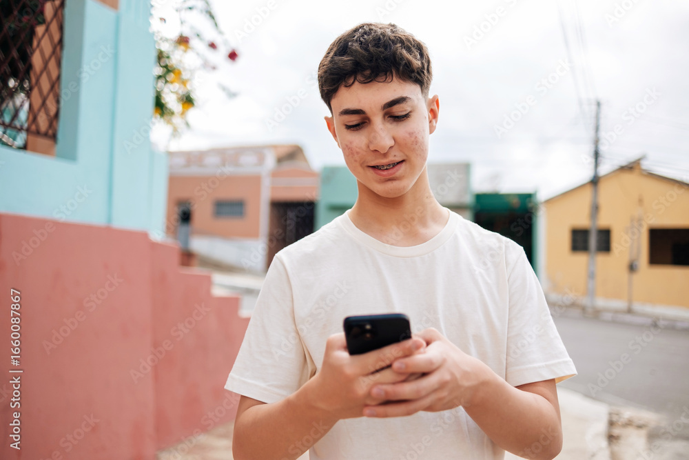 Teenage boy with braces using smartphone outdoors in colorful neighborhood