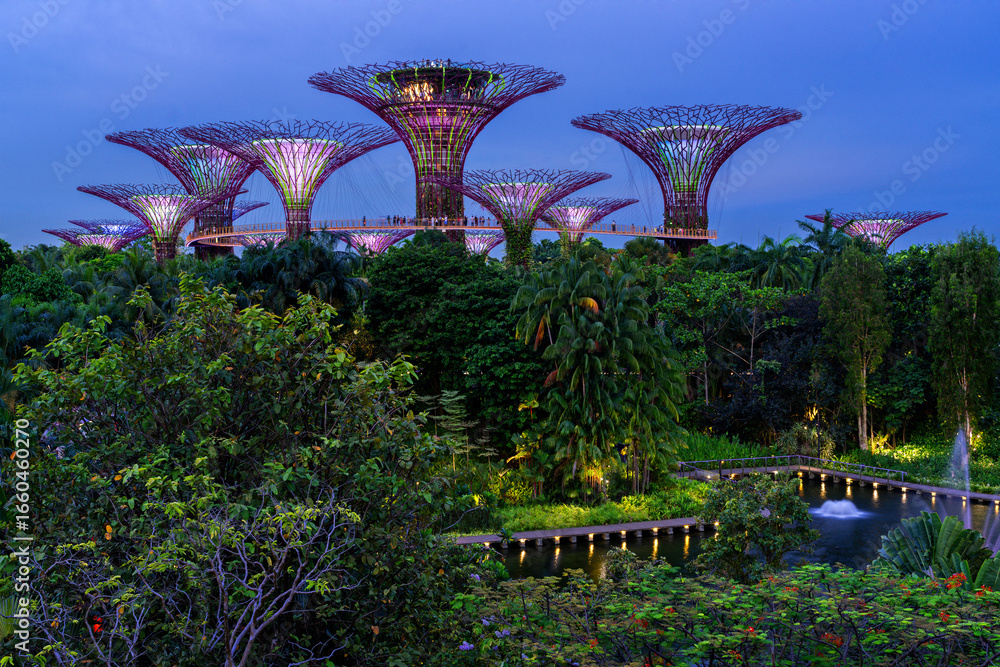 Illuminated super trees at the Gardens of the Bay known as also Marina Bay Gardens in Singapore