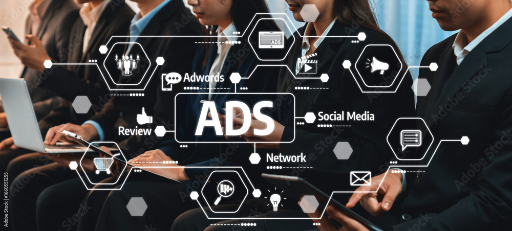 A diverse group of professionals engaged in a business meeting focused on advertising and digital marketing strategies. Technology plays a vital role in their discussions for creative insights. Amity