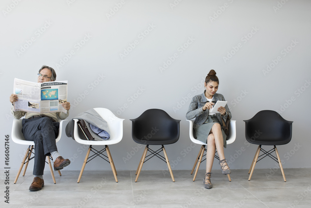 Man reading newspaper and woman using digital tablet