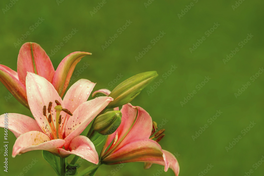 Pink orange lilies flowers on green background
