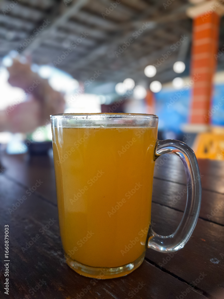 Hot orange drink in glass mug on wooden table