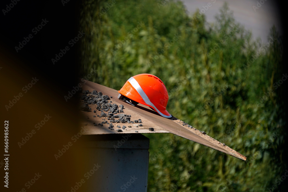 Helmet rests. Work pauses. Safety waits. Orange shines.