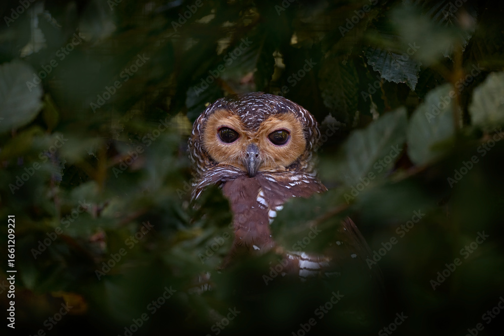 Spotted wood owl, Strix seloputo, close-up detail portrait in the green forest vegetation, Malaysia in Asia. Owl in the nature habitat. Bird in forest, big eyes, wildlife.