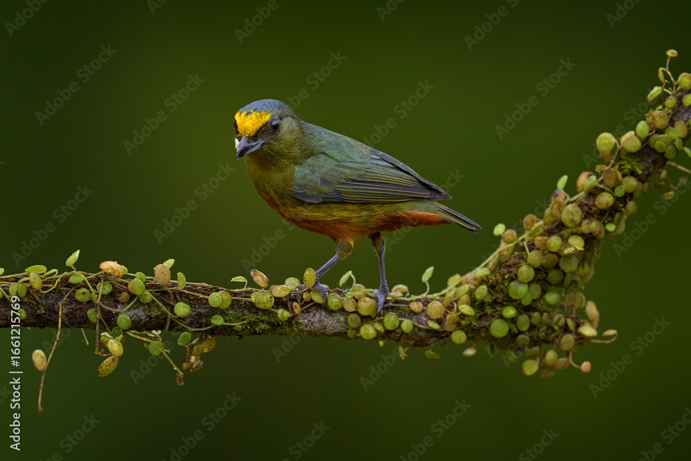 Olive-backed euphonia, Euphonia gouldi, exotic tropical bird from Costa Rica. Bird sitting on beautiful green mossy branch. Birdwatching in South America.