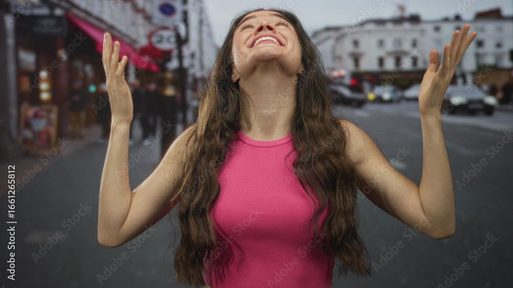 Hispanic woman with arms raised on bustling city street wearing a pink top and smiling broadly; optimism.