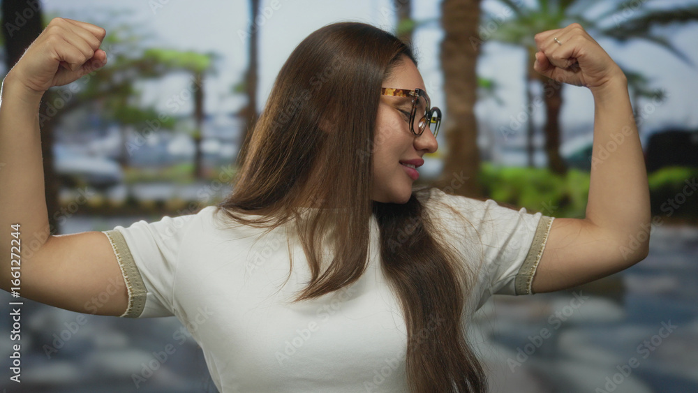 Young hispanic woman flexes bare arms and clenches fists in sunlit green park with palm trees lining walkway; confidence.