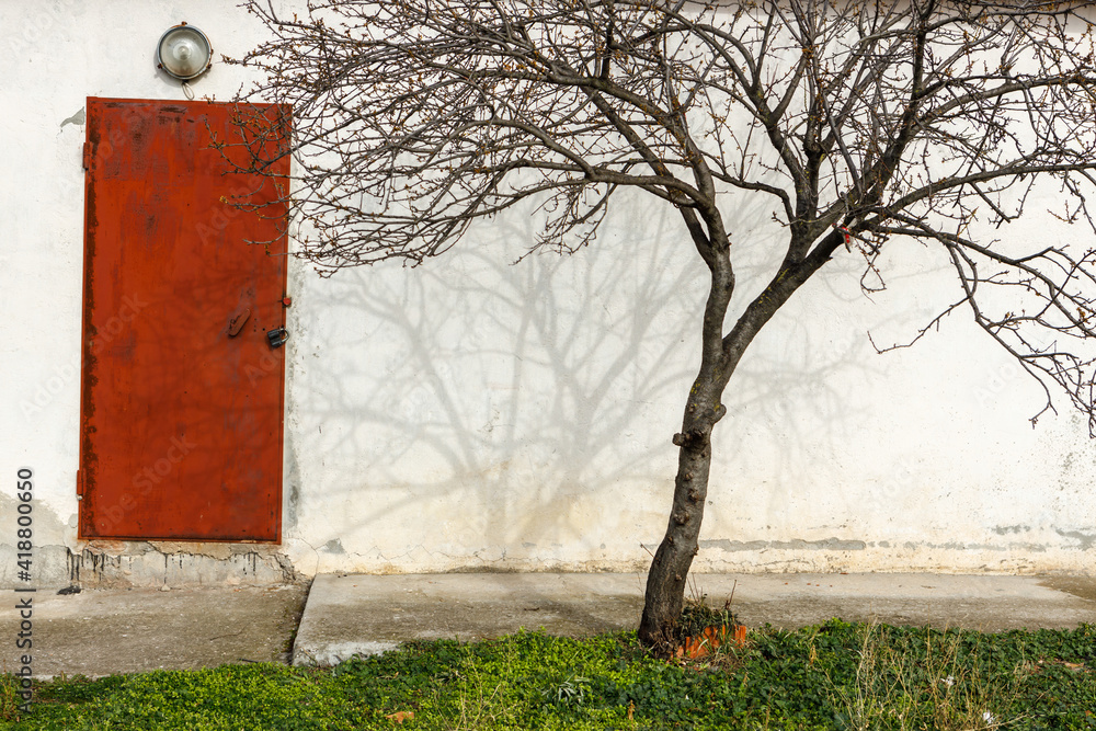 Minimalistic aesthetic still life with white blank frame and dry grass on beige background