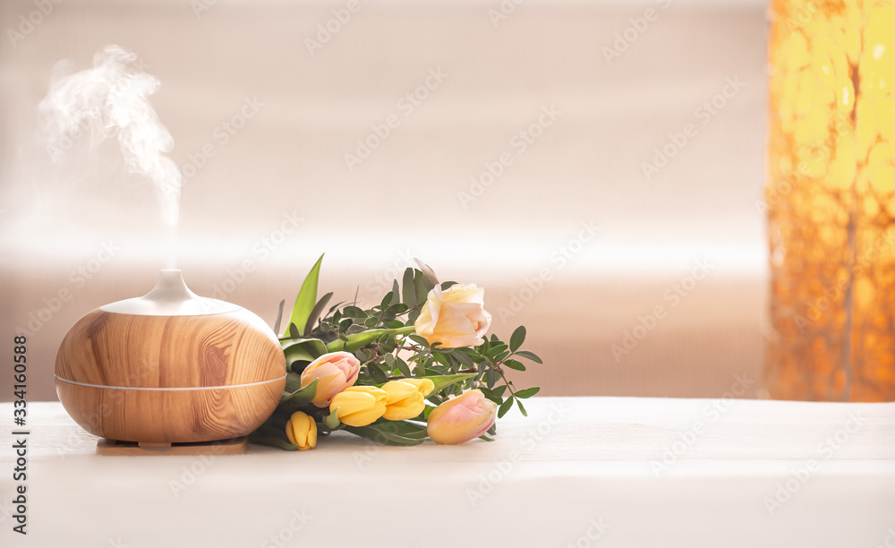 Wireless bluetooth stereo speaker with David bust on yellow background. Top view