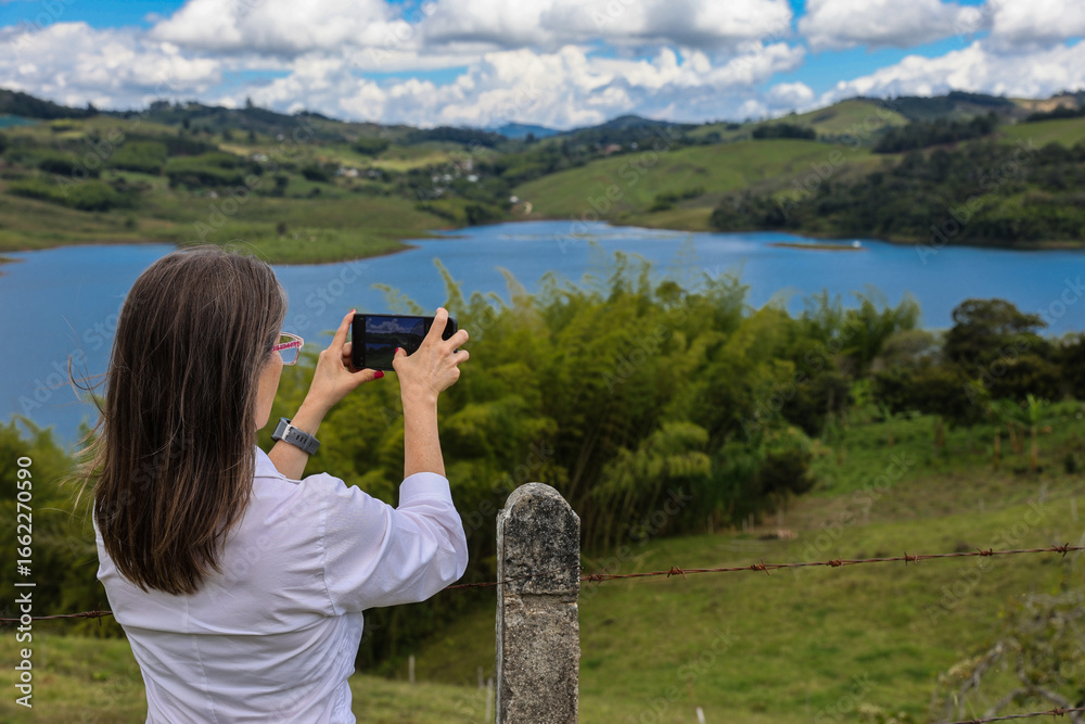 Female tourist taking pictures at the biggest artificial lake in Colombia called Calima Lake located on the mountains of Darien at the region of Valle del Cauca