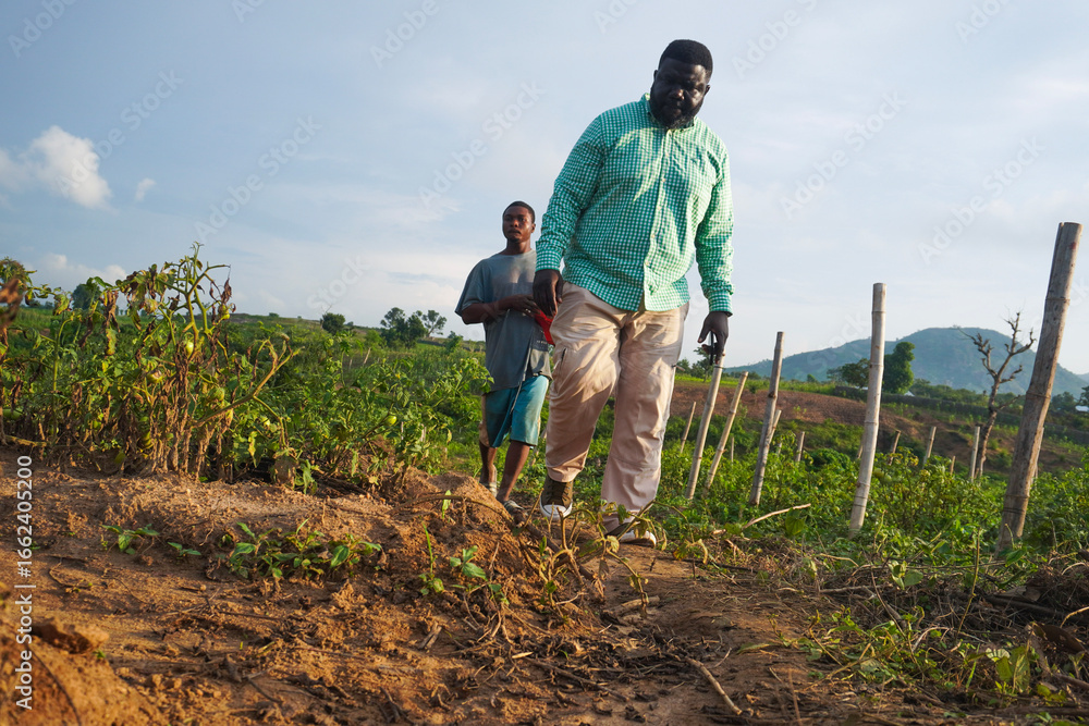 Two African farmers picking tomatoes from the outdoor garden