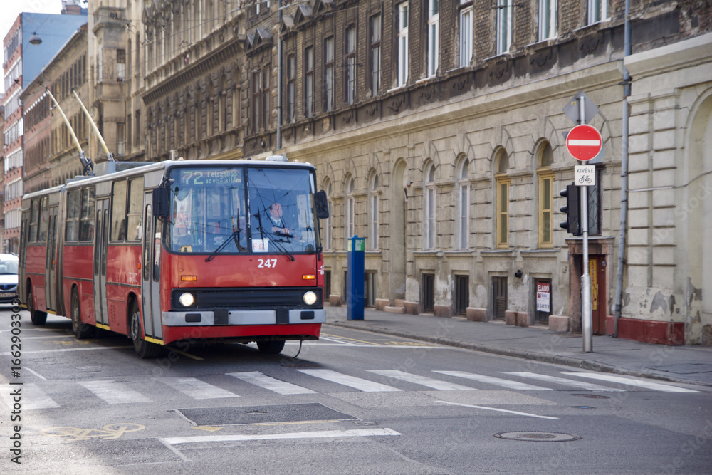 Budapest, Hungary, March 4, 2019: Historic Red Ikarus Trolleybus in Front of Classic Buildings