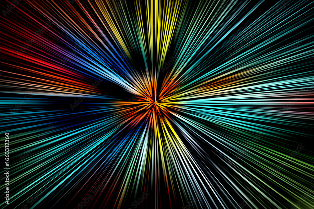 Abstract surface of radial blur zoom in red, yellow, blue, green, orange tones on a black background. creating vibrant light streaks with cosmic and dynamic energy.