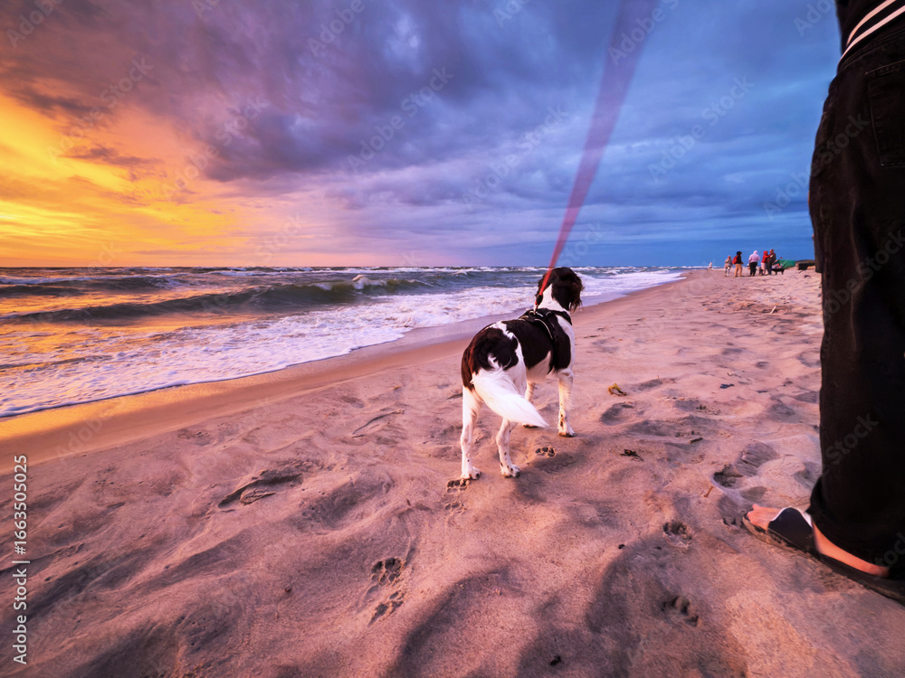 Pies na smyczy na plaży, Mały Munsterlander, wyżeł na plaży, ognisty zachód słońca, pomarańczowe i niebieskie niebo. Chmury. Pies na wakacjach, urlop z psem.