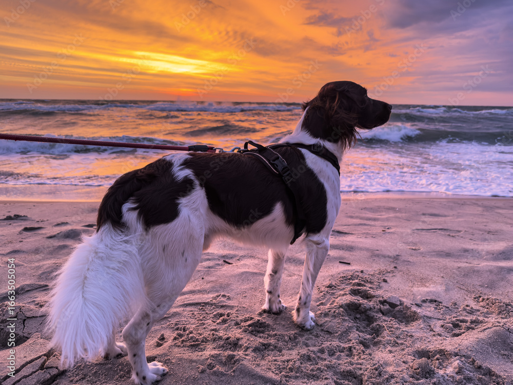 Pies na smyczy na plaży, Mały Munsterlander, wyżeł na plaży, ognisty zachód słońca, pomarańczowe i niebieskie niebo. Chmury. Pies na wakacjach, urlop z psem.