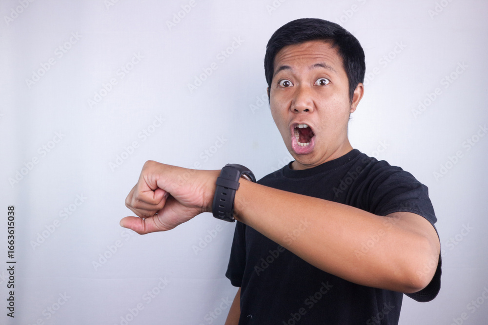 Funny shocked face expression of asian man looking at the watch time worried, afraid of getting late