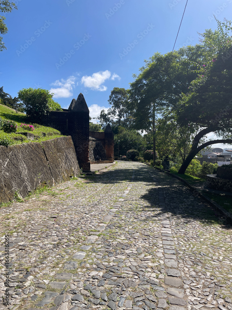 Camino antiguo hecho de piedra al medio día, cubierto por los reflejos de la luz y la sombra, fotografía hecha con el teléfono móvil. Toma Vertical.