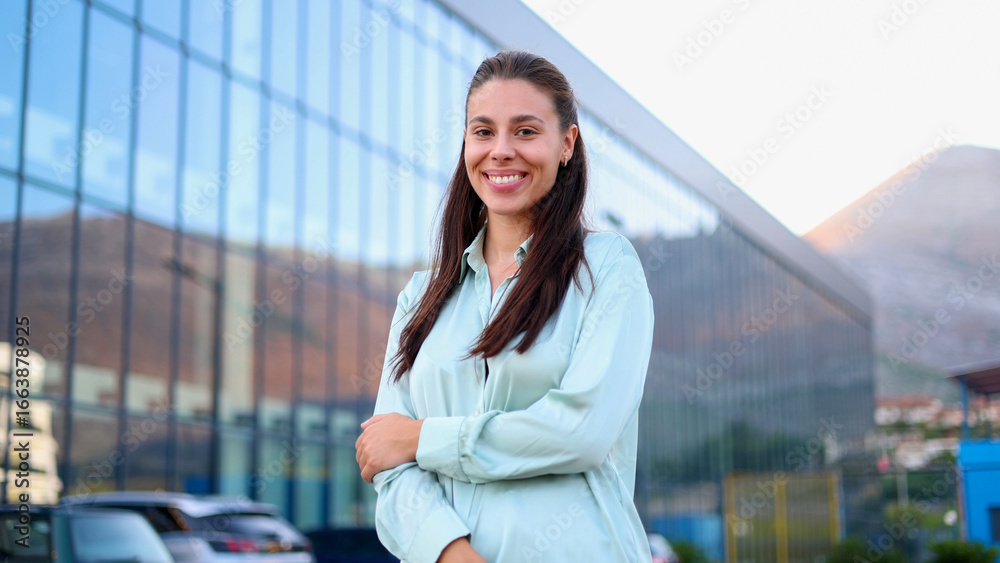 Professional businesswoman crossing arms, smiling confidently near sleek corporate exterior, embodying corporate leadership and achievement