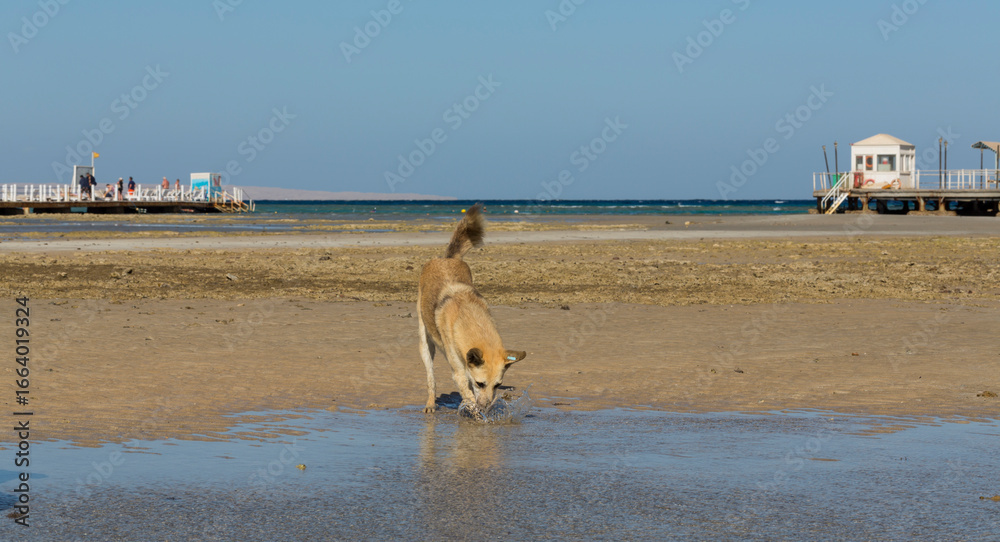 Egypt. Red wild dogs on the shore of the red sea. The animal catches fish at low tide. The hunting skills of a predator.