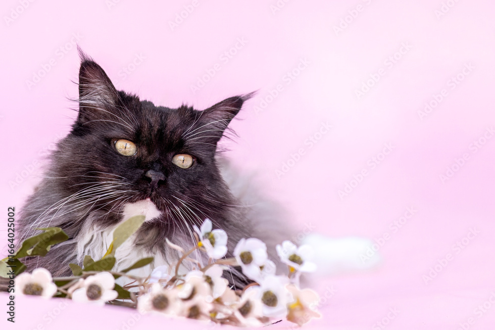 Fluffy black and white Maine Coon mix cat with flowers in studio