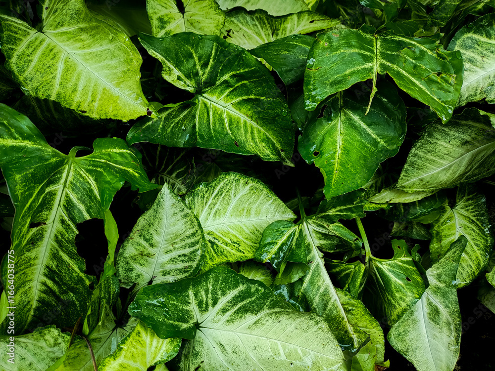 Beautiful green background in the tropical garden of Syngonium podophyllum leaves
