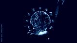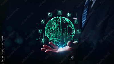 Digital green globe with ESG and smart city icons in businessman’s hands, symbolizing sustainable innovation, environmental responsibility, and future technology. 3d Rendering