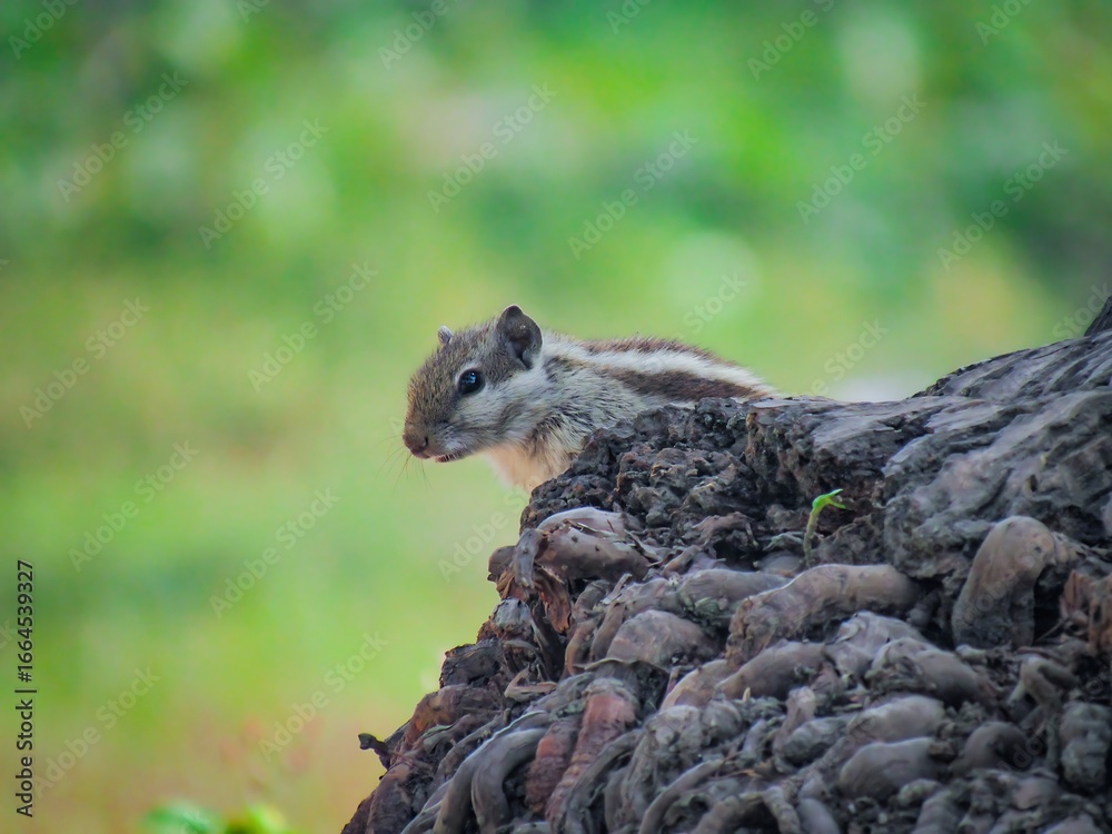 Alert squirrel pauses on a textured tree trunk with a soft green background