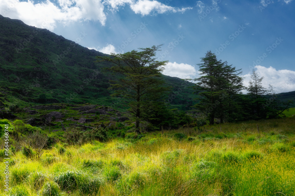 A vibrant green, grassy field stretches toward a dark mountain slope. Scattered trees punctuate the landscape under a bright blue sky dotted with fluffy white clouds in Ireland.