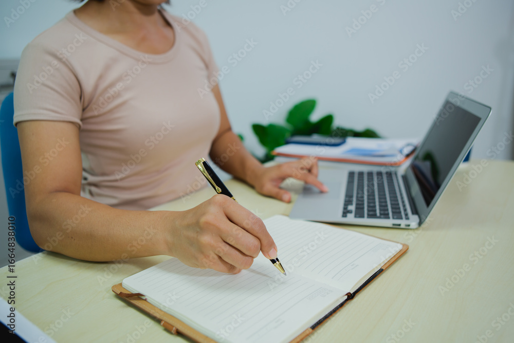 An Asian female employee is diligently working on her assigned task. She appears focused and organized, typing on her computer, reviewing documents, and maintaining a professional