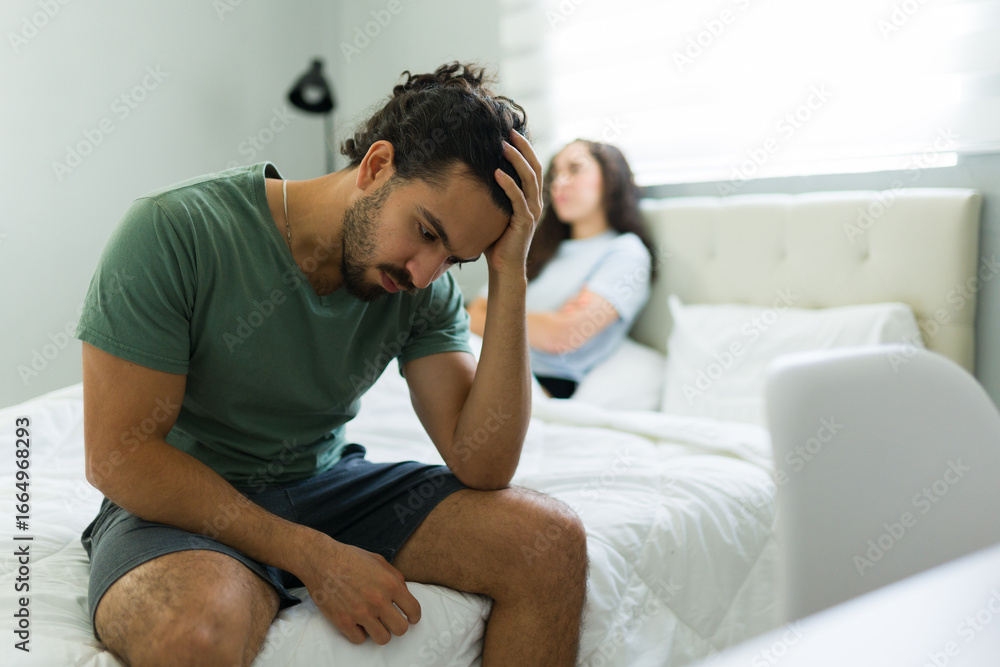Sad young man feeling depressed after arguing with partner in bedroom