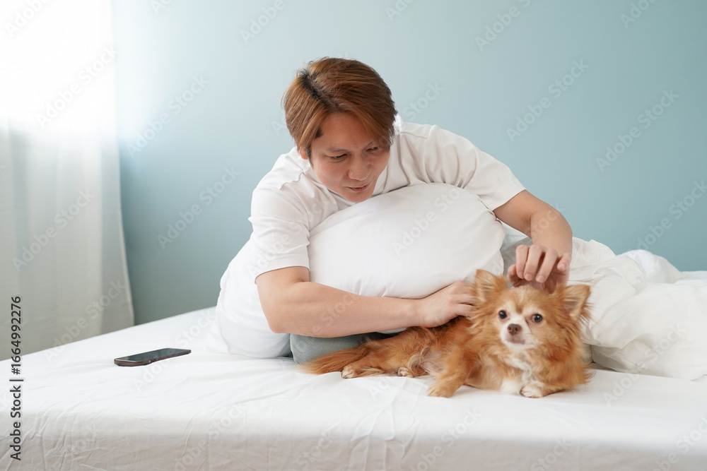 Asian man sitting comfortably on bed playing with his Chihuahua dog. Cozy home lifestyle showing love for pets, relaxation, companionship, happiness, casual living, and modern everyday life scene