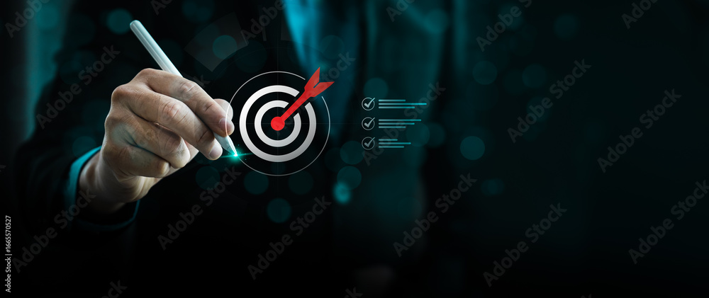 Business goal setting concept with businessman using digital stylus to target center of dartboard, symbolizing strategic planning, objective alignment, achievement checklist for organizational success