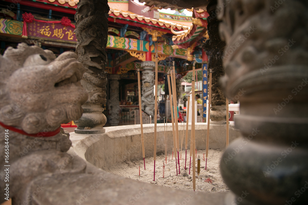 Burning incense sticks on the doors of temples in Malaysia. Burning incense sticks inside a large metal container. Many incense sticks lit at the same time in the temples of Malaysia.