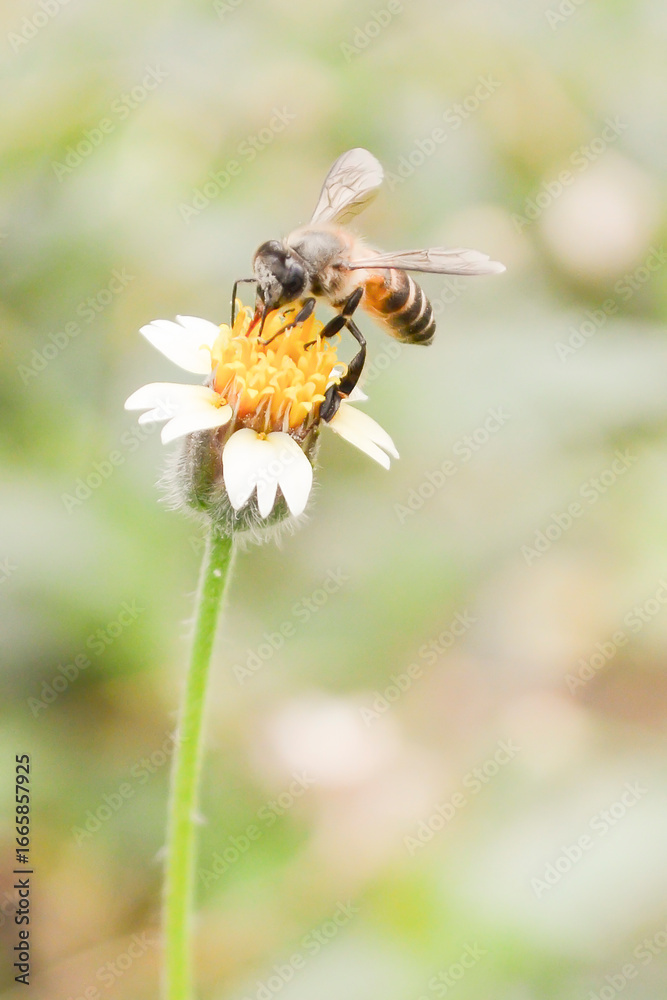 Bee on yellow flower and yellow field. Spring single daisy flower and bee. Flying honey bee collecting pollen at yellow flower. Bee flying over the yellow flower in blur background.