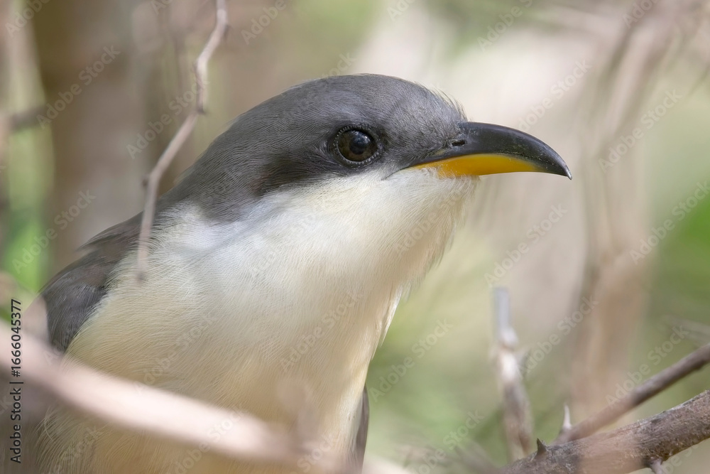 Mangrove Cuckoo, (Coccyzus minor), very close portrait, perched in bushes on Grenada, West Indies.