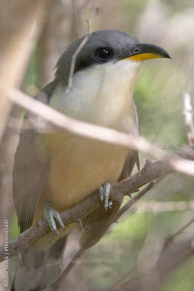 Mangrove Cuckoo, (Coccyzus minor), close, perched in bushes on Grenada, West Indies.