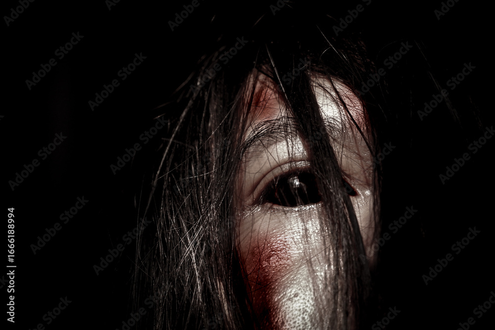 Horror Ghost Woman Portrait with Bloody Face and Dark Hair in Darkness