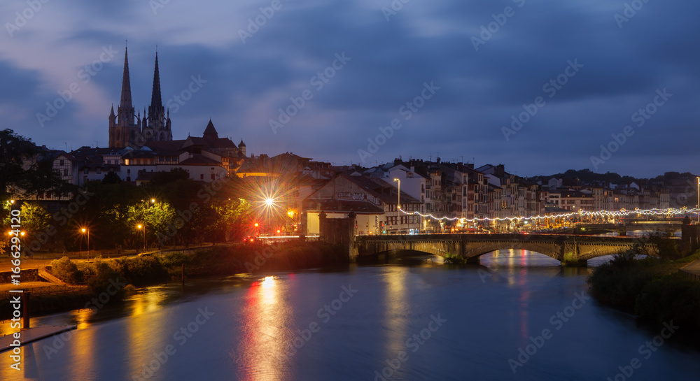 Vue sur la ville de Bayonne de nuit au dessus de la Nive
