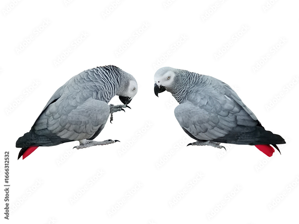 Close-up image of two African Grey Parrots isolated on a transparent background png file.