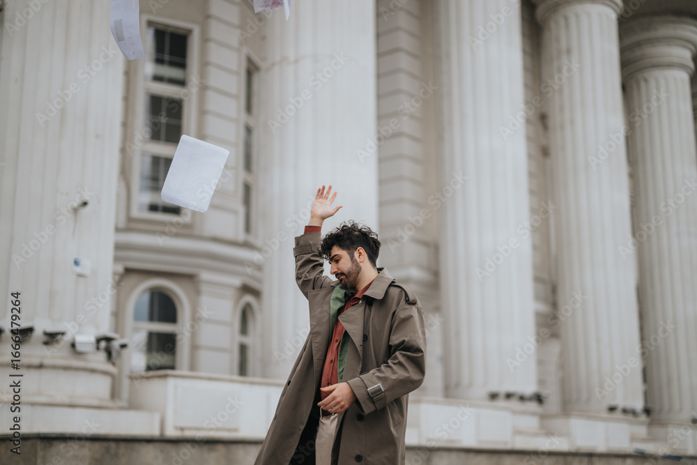 A young businessman passionately throws papers into the air while standing in front of an elegant building with classical architecture, portraying a moment of freedom, expression, and defiance.