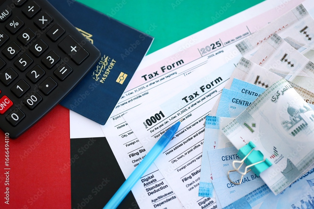 United Arab Emirates dirham money bills and calculator with tax form on flag close up. Taxation and accounting concept