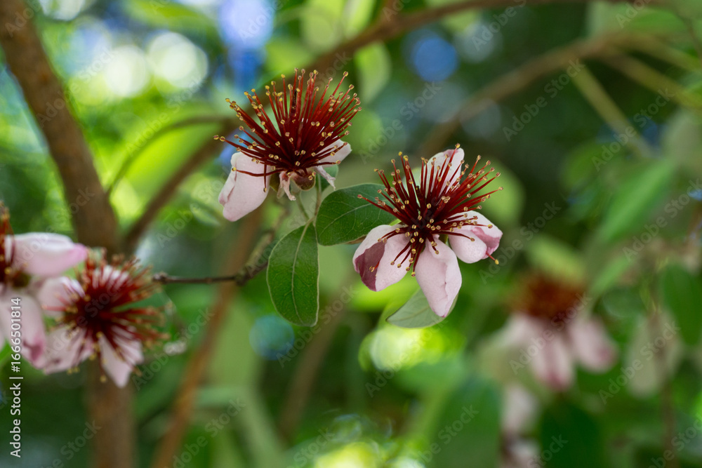 Cluster of delicate pink flowers of Feijoa sellowiana (Acca Sellowiana) with prominent red stamens, surrounded by glossy green leaves and set against soft, blurred natural background