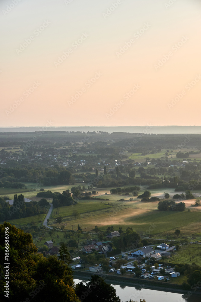 River Seine View From Elevated Hill in Normandy Picturesque aerial perspective of winding river surrounded by green countryside.