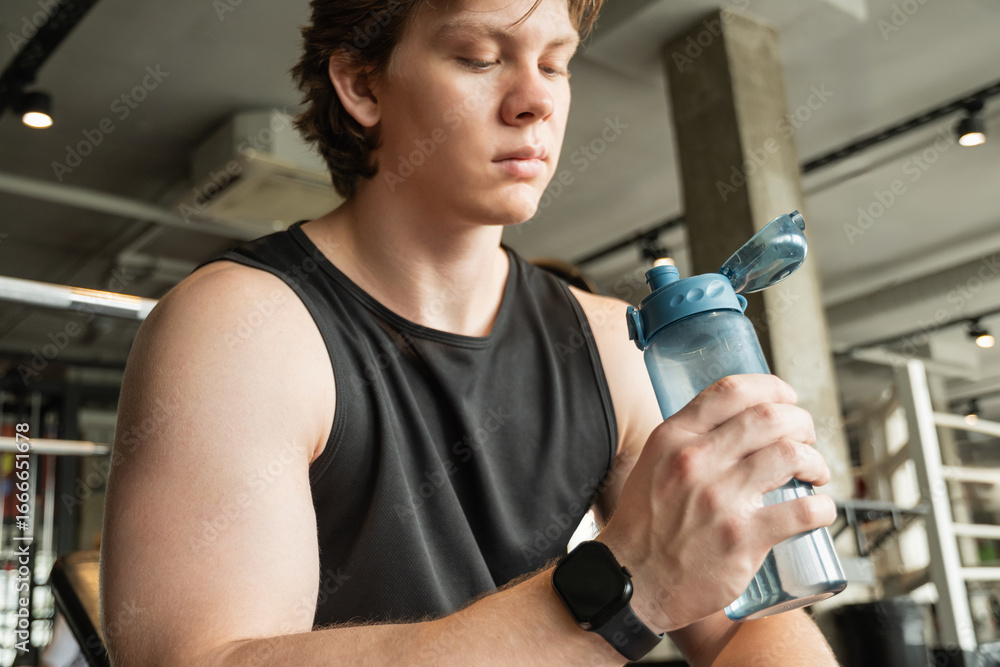 Sporty caucasian man wearing blank sleeveless tank top with water bottle in hand at gym. Relaxation after workout. Water balance. Close up.
